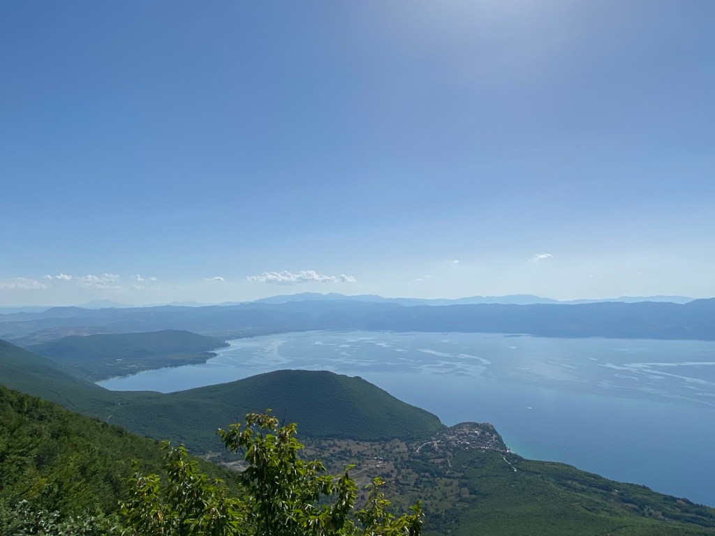 Wir machen nun einen kleinen Ausflug mit dem Kadett – an der Küste entlang geht es gen Süden, werfen einen kurzen Blick auf die Bay of Bones – rekonstruierte Pfahlbauten im Ohridsee – und verlassen dann das Ufer um in die Berge zu fahren. Die Einfahrt in den Galičica-Nationalpark kostet ca. 1,50€, der Lohn sind fantastische Aussichten auf den Ohridsee, nach Albanien und den Prespasee. Der Prespasee speist eine Quelle, welche wiederum unterirdisch den Ohridsee speist – damit wäre dieses Rätsel dann auch geklärt. Wir fahren die lange Serpentinenstraße, halten hier und dort an, bis uns schließlich die Lust verlässt und wir umkehren.